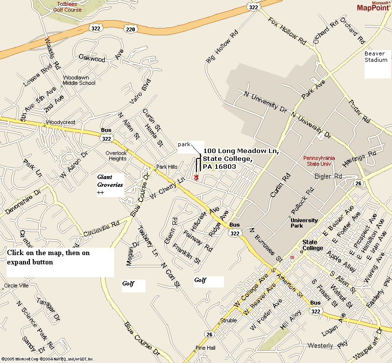 From North, head into State College on N. Atherton, going down hill look for T.J. Fridays on left, at next traffic light (a Blockbuster Video is on one corner, a gas station on another)  turn left, bear to right up N. Allen.  Longmeadow is the third street on the left.  The duplex is on the corner.