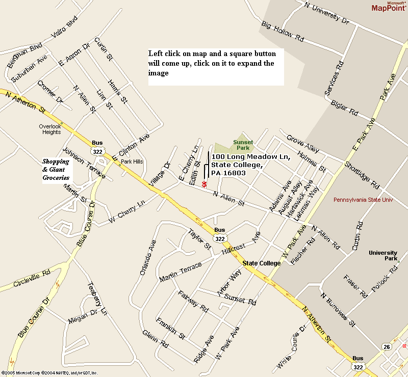 From North, head into State College on N. Atherton, going down hill look for T.J. Fridays on left, at next traffic light (a Blockbuster Video is on one corner, a gas station on another)  turn left, bear to right up N. Allen.  Longmeadow is the third street on the left.  The duplex is on the corner.